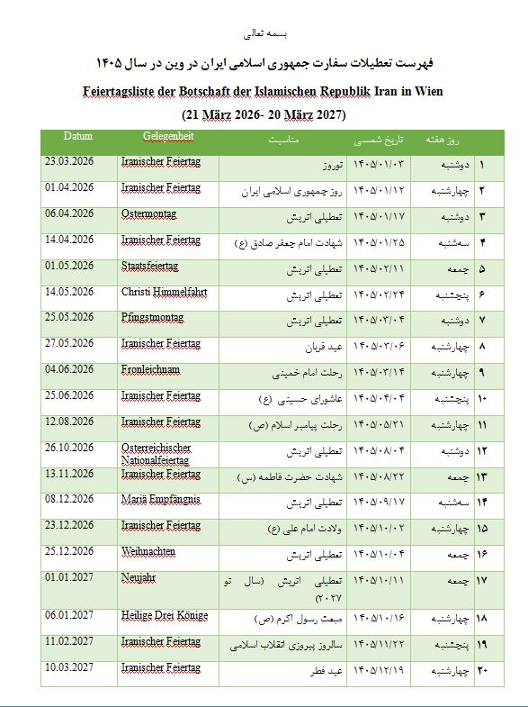 Feiertagsliste der Botschaft der Islamischen Republik Iran in Wien