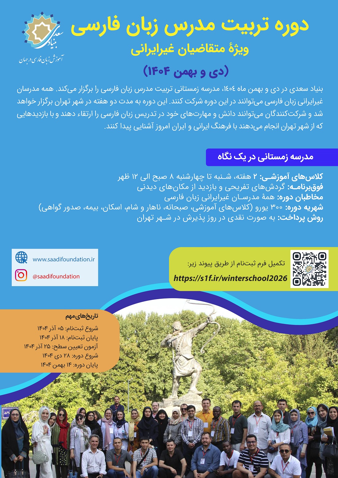 بنیاد سعدی در دی و بهمن 1404 مدرسه زمستانی تربیت مدرس زبان فارسی را برگزار می‌کند. همه مدرسان غیر ایرانی زبان فارسی می‌توانند در این دوره شرکت کنند. این دوره به مدت دو هفته در شهر تهران برگزار خواهد شد. برای تکمیل فرم ثبت نام لطفا به پیوند زیر مراجعه کنید: